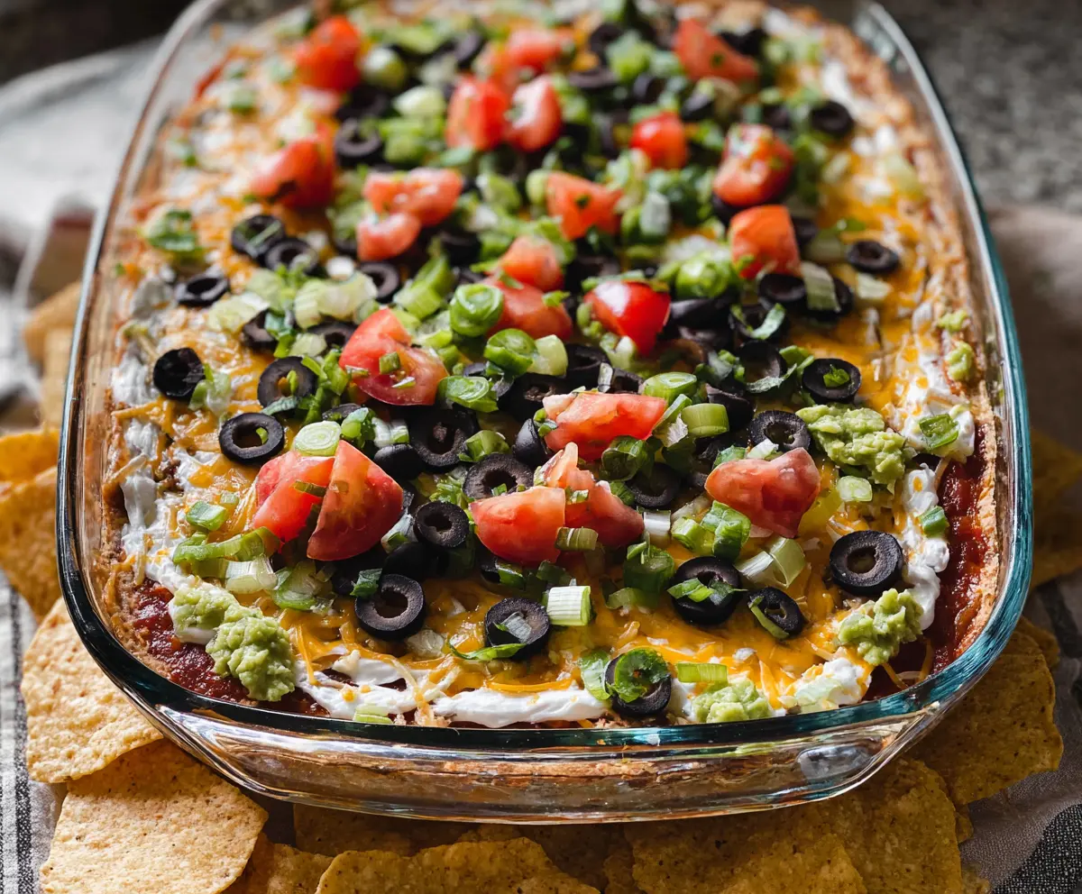 - Finish with lighter toppings like olives, tomatoes, and onions. They look great and keep the dip visually appealing!