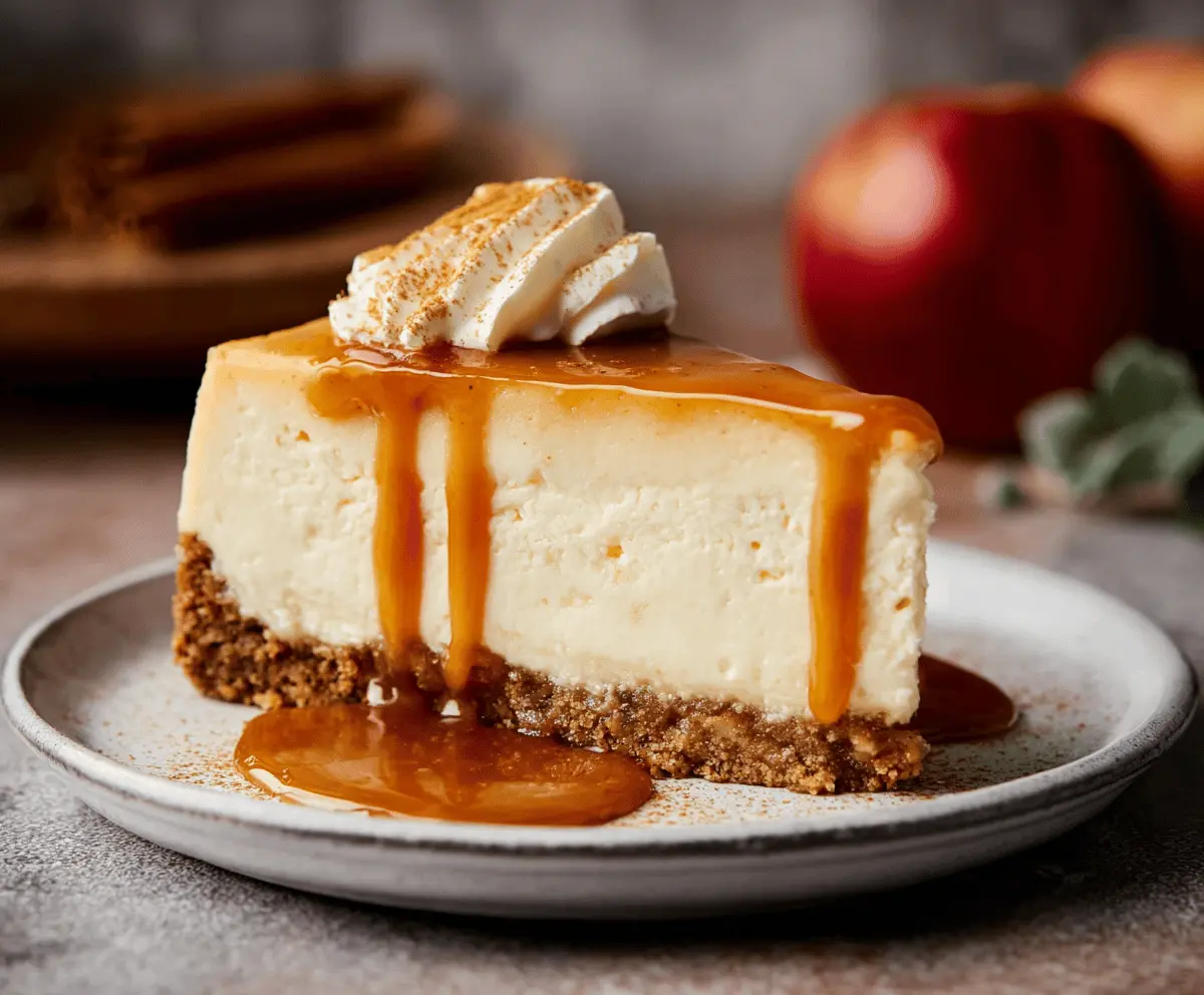 After the cheesecake has chilled, gently remove it from the springform pan. Drizzle the luscious apple cider caramel sauce generously over the cheesecake, letting it drip down the sides for that gorgeous look. You can top it with whipped cream and add a few slices of sautéed apples if you’d like for extra flair. Don’t forget to dust it lightly with ground cinnamon too!
