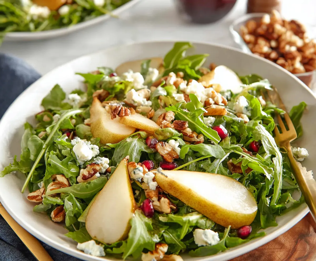 Start by washing and drying the fresh arugula thoroughly to remove any dirt. In a large salad bowl, place the arugula as your base. This leafy green adds a peppery flavor that pairs wonderfully with the sweetness of the pears.