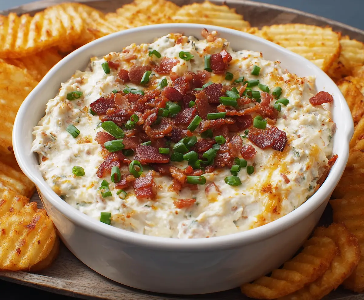 This creamy Baked Potato Dip brings all the yummy flavors of a loaded baked potato right to your party! It’s packed with cheese, bacon, and a sprinkle of green onions.