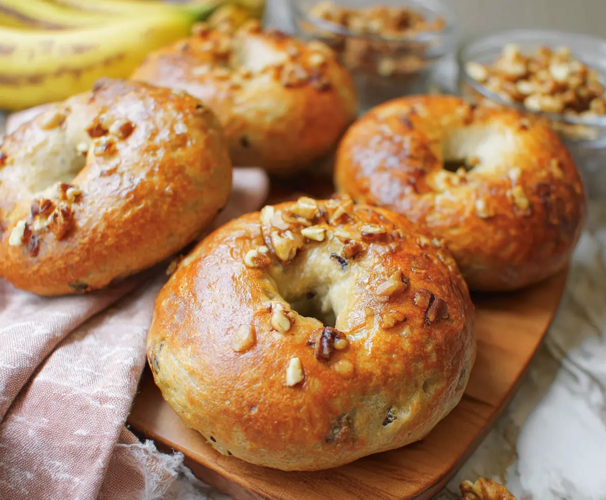 This recipe takes about 20 minutes of active preparation time, plus around 2 hours total for rising and boiling. You’ll need about 1 to 1½ hours for the first rise, 30 minutes for the second rise, and then 20-25 minutes for baking. By the end, you’ll have fresh and tasty banana nut bagels ready to enjoy!