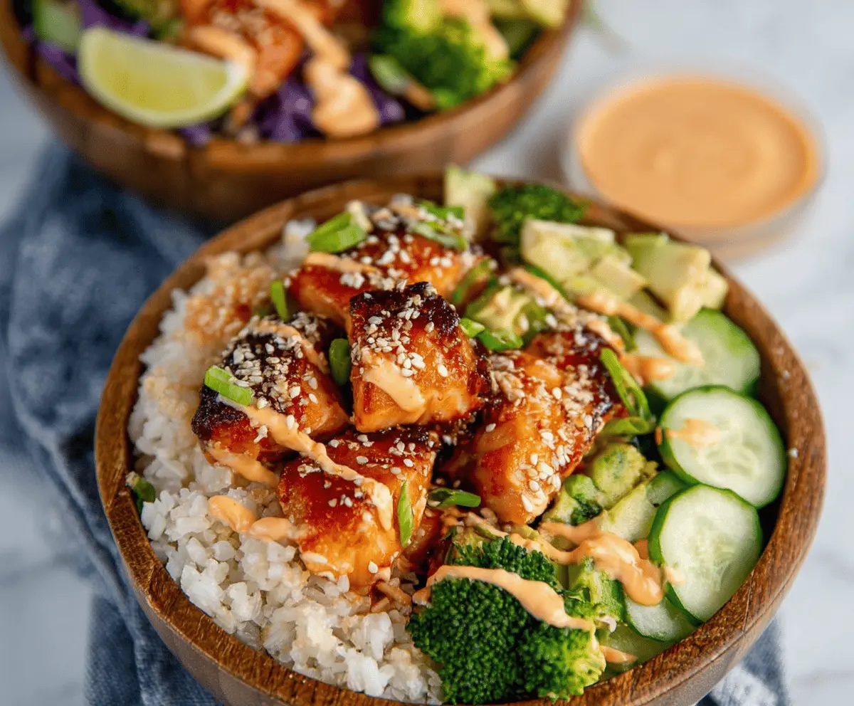 Delicious Bang Bang Salmon Bite Bowls featuring crispy salmon bites topped with spicy mayo and fresh vegetables in a bowl.