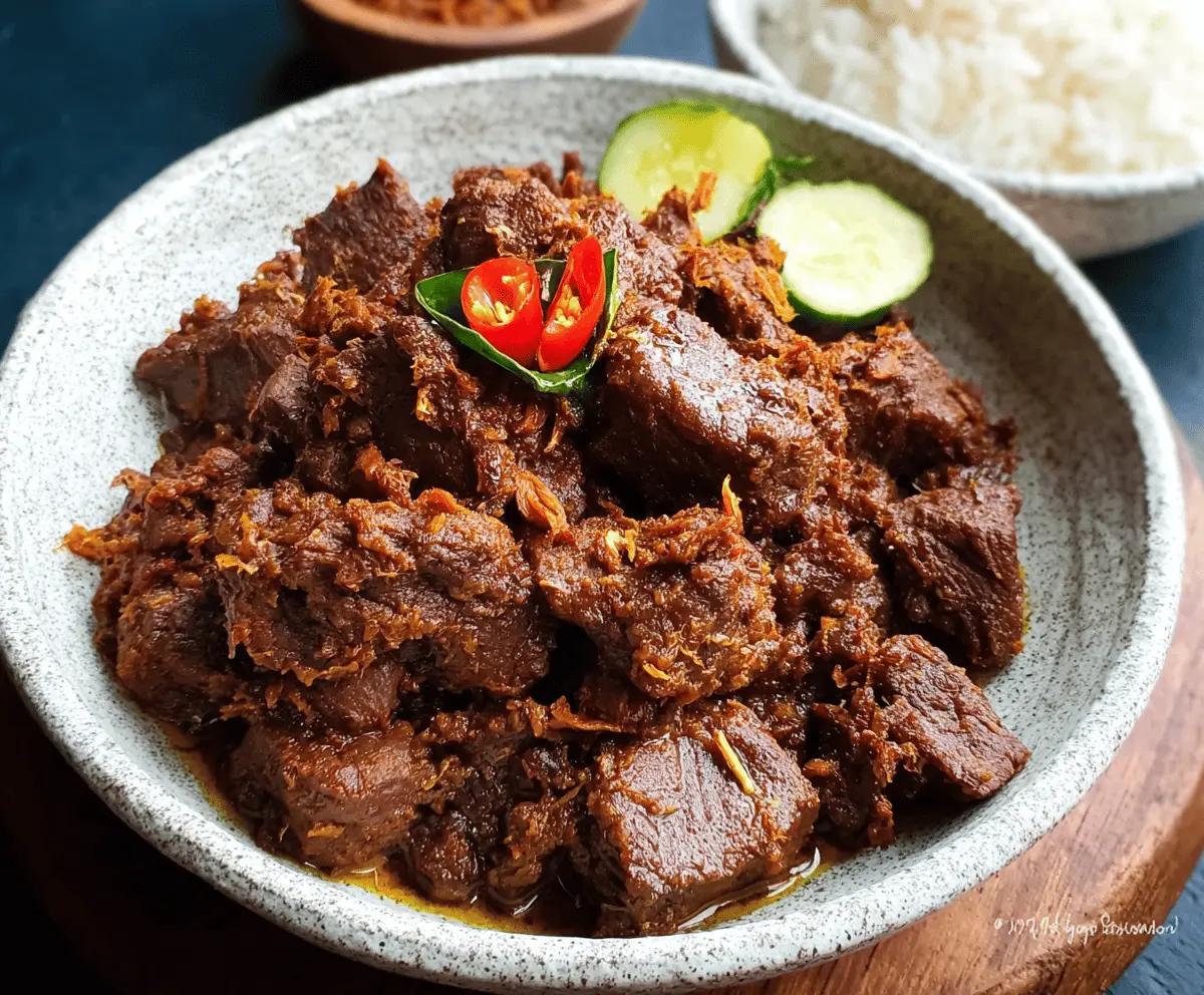 Delicious Beef Rendang served in a bowl with rich, flavorful coconut curry sauce and aromatic spices, garnished with fresh herbs.