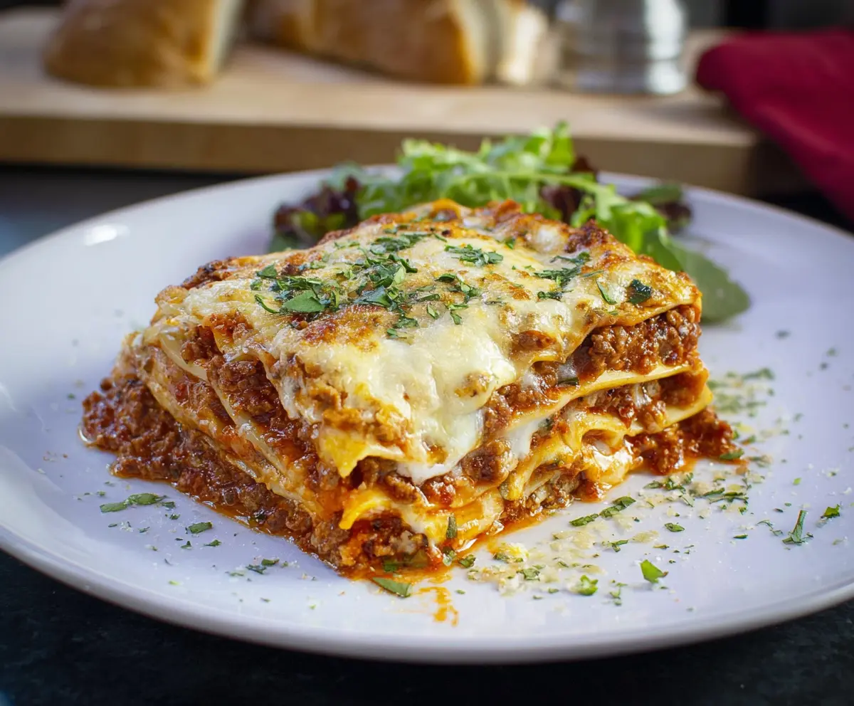 Once done, remove the lasagna from the oven and let it rest for 10-15 minutes. This helps it set so you can cut nice pieces. Garnish with chopped fresh parsley or basil before serving!