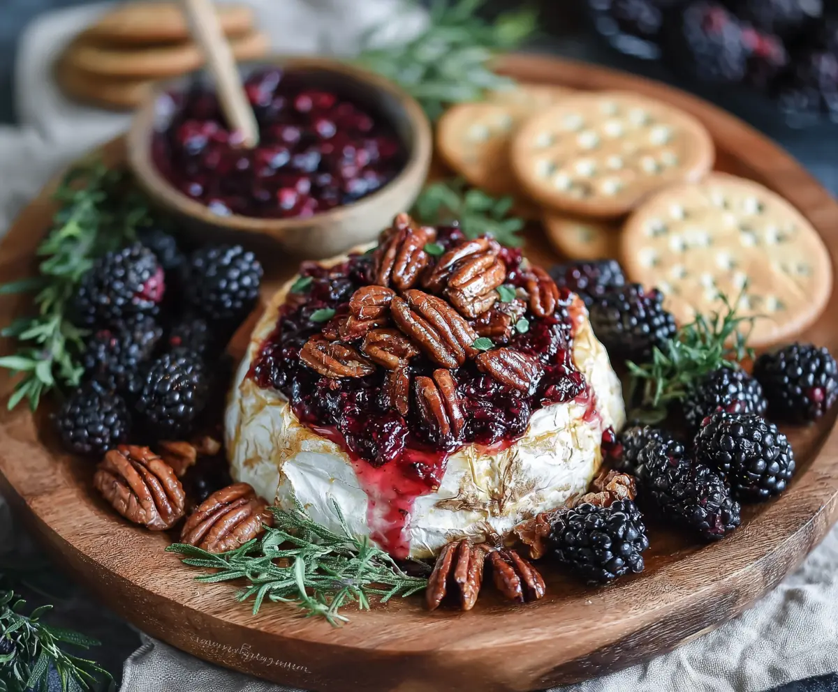 Delicious Blackberry Compote with Spicy Pecan Baked Brie on a wooden platter.