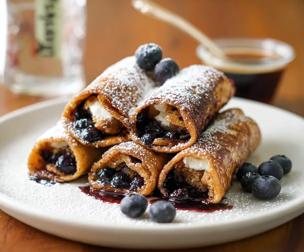 Once cooked, transfer the roll ups to serving plates. Dust them generously with powdered sugar and garnish with extra fresh blueberries for that perfect touch. They’re best served warm with a drizzle of maple syrup or blueberry sauce on top.