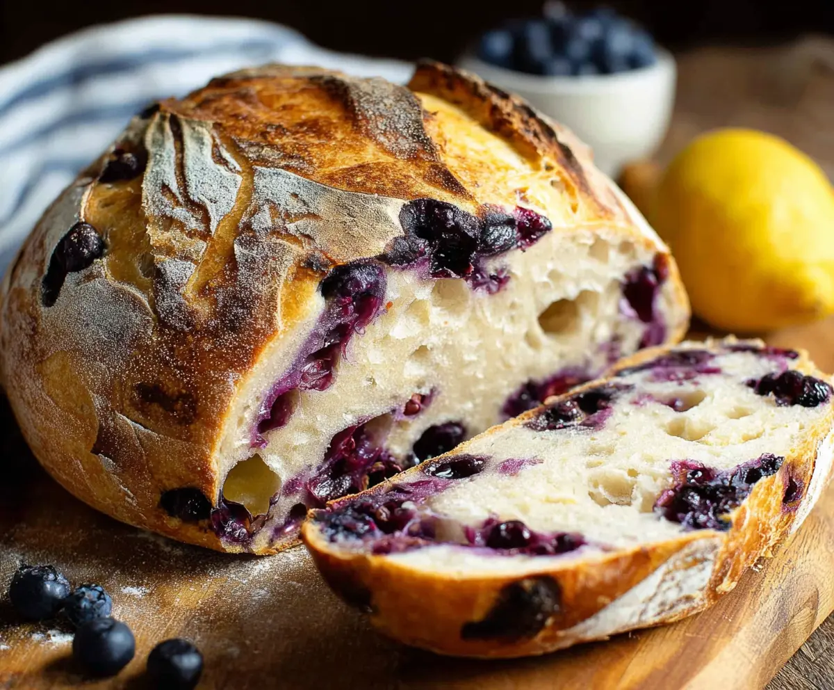 Freshly baked blueberry lemon sourdough bread with a golden crust and vibrant berry filling.