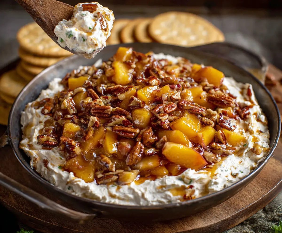 This Bourbon Peach Pecan Dip combines sweet peaches, crunchy pecans, and a hint of bourbon for a fun twist! It’s creamy, easy to make, and perfect for sharing at parties.