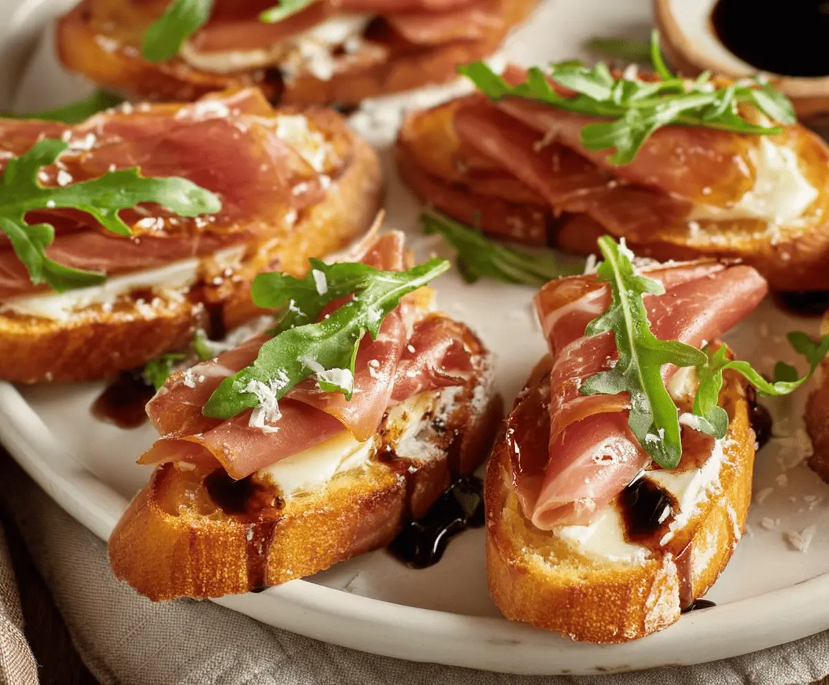 Brie and prosciutto crostini served on a rustic platter, garnished with fresh herbs.