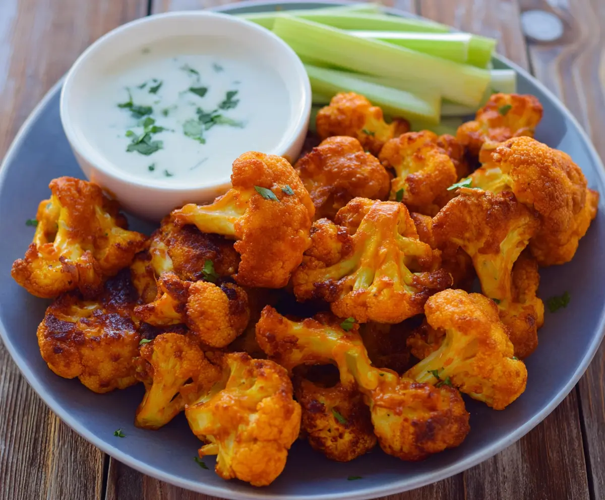 Enjoy your crispy, spicy Buffalo Cauliflower Wings—perfect for game day or a fun snack anytime!