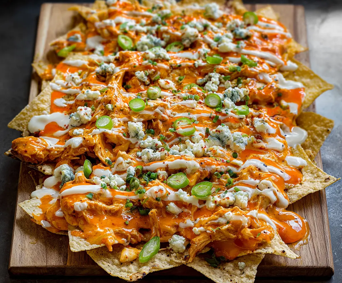 These nachos are sure to be a crowd-pleaser, with layers of crunchy chips, spicy buffalo chicken, and fresh toppings that create a delightful flavor explosion with every bite!