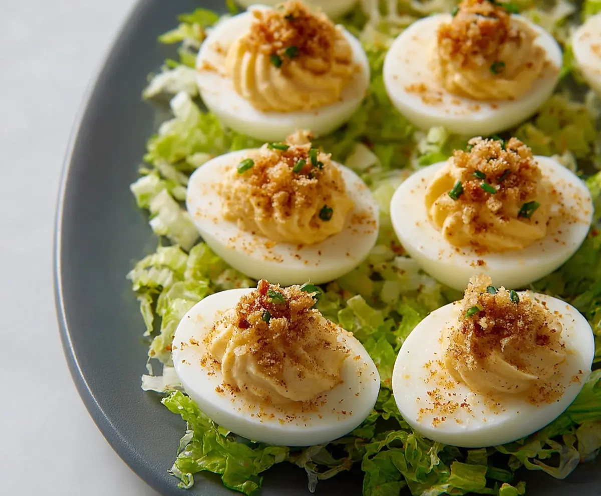 Take a moment to make them look pretty! Lightly sprinkle paprika over each deviled egg and top with chopped chives or green onions. If you’re feeling fancy, add some crispy bacon bits or croutons for extra crunch. Arrange them on the platter over the shredded romaine lettuce, and serve these delicious Caesar Deviled Eggs chilled for the best experience. Enjoy!