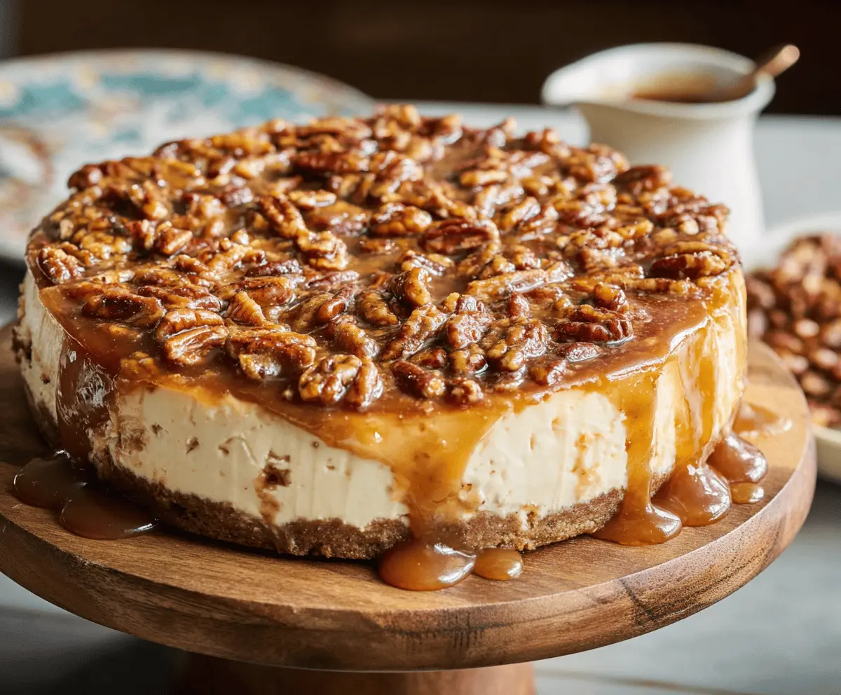 To finish, gently remove the cheesecake from the springform pan and place it on a serving plate. Spoon that warm caramel pecan mixture over the top, spreading it out evenly and letting some caramel drip down the sides for that perfect look. Allow it to set for about 20 minutes before slicing and serving. Enjoy every creamy, caramel-drizzled bite!