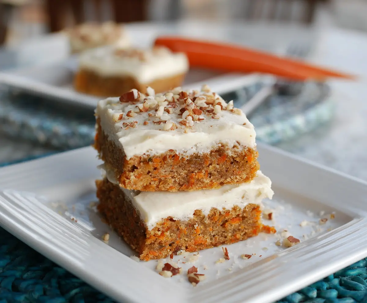 If you like, sprinkle some chopped nuts or extra grated carrot on top for a lovely garnish. Finally, cut the cake into bars and serve! Enjoy your delicious, moist carrot cake bars with the creamy frosting!