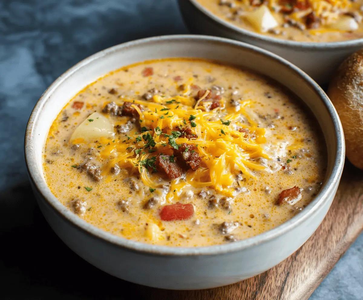Cheeseburger Soup is a creamy and cheesy delight that brings all the flavors of a classic cheeseburger in a cozy bowl. Made with ground beef, cheese, and veggies, it’s quick to whip up!