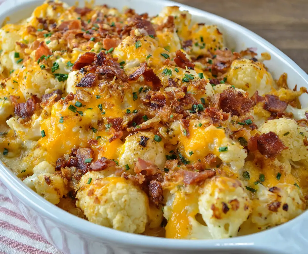 This Cheesy Loaded Cauliflower Casserole is a creamy, cheesy delight! It’s packed with yummy flavors from broccoli, cheese, and crispy bacon bits, making it a hearty side dish.