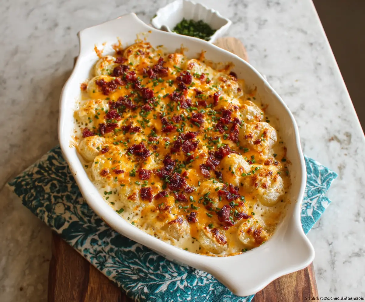 Once out of the oven, sprinkle some additional crumbled bacon and chopped green onions or chives on top for a fresh burst of flavor and a lovely presentation.