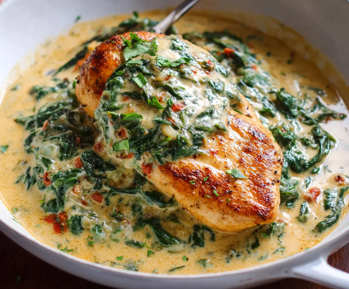 This recipe yields a creamy, flavorful chicken dish infused with the richness of spinach and Parmesan sauce, accented by fresh tomatoes. Perfect for dinner!