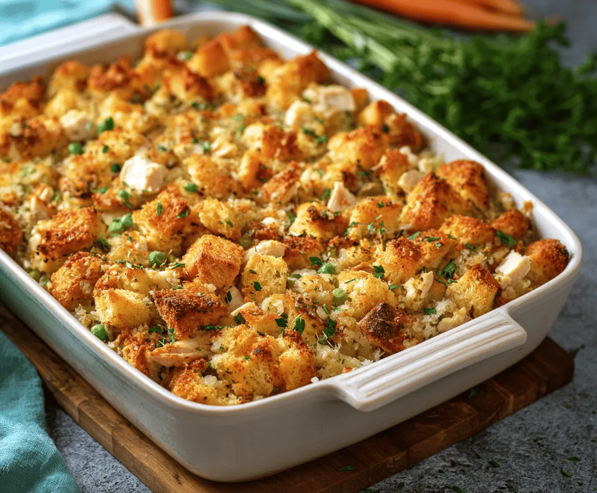 This Chicken & Stuffing Casserole combines tender chicken with fluffy stuffing, all baked to a golden brown. It’s warm, comforting, and perfect for family dinners.