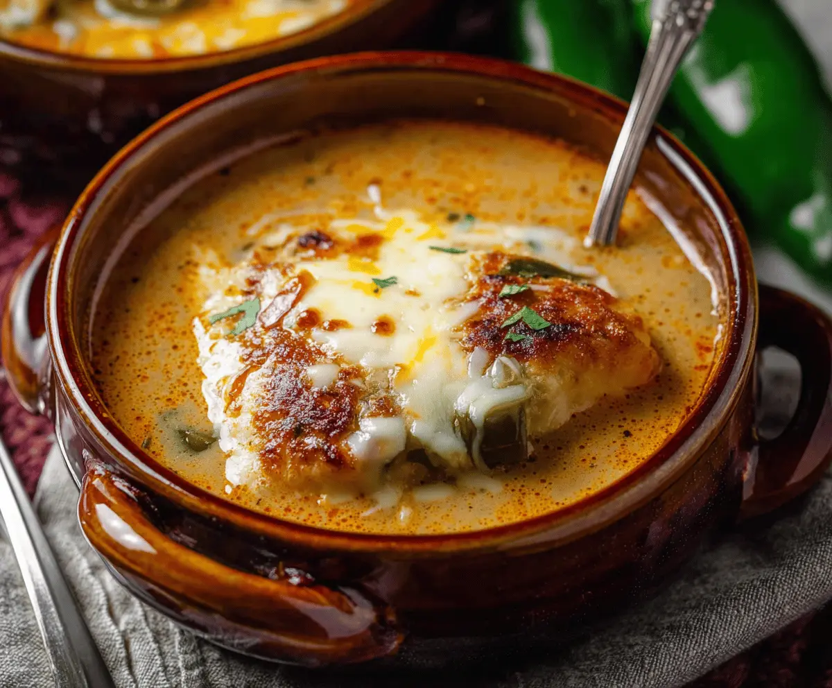 Enjoy your comforting Chile Relleno Soup, filled with the luscious flavors of roasted peppers and melty cheese in a creamy, spicy broth!