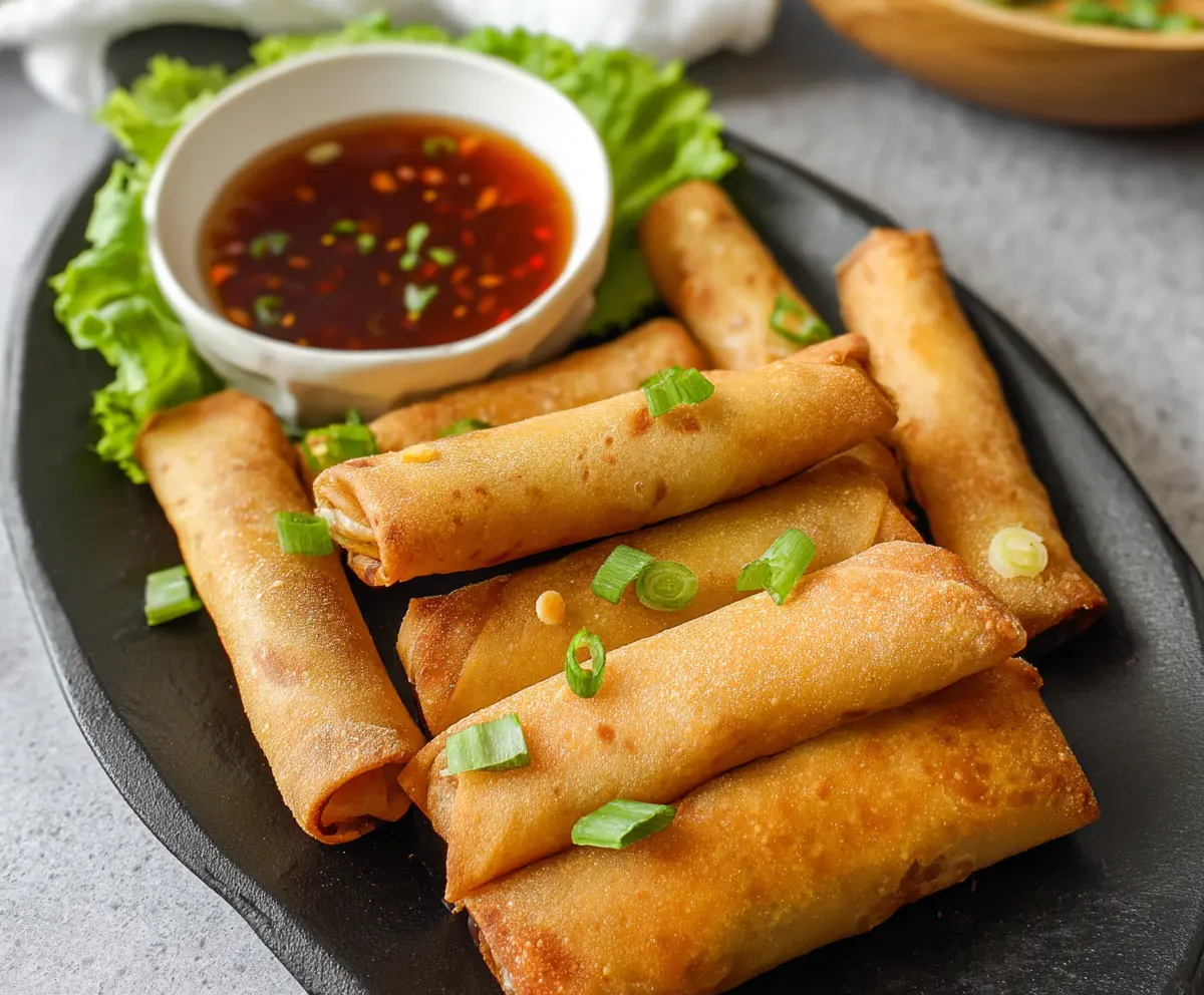 Your delicious spring rolls are now ready! Serve them hot, garnished with chopped green onions and fresh lime wedges, alongside the tasty dipping sauce. Enjoy the crispy, flavorful bites!