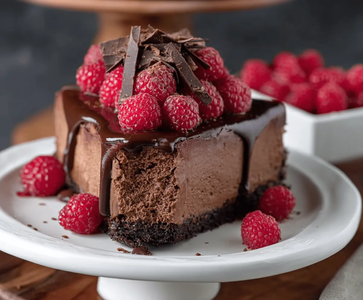 Delicious Chocolate Raspberry Cheesecake with rich chocolate topping and fresh raspberry garnish