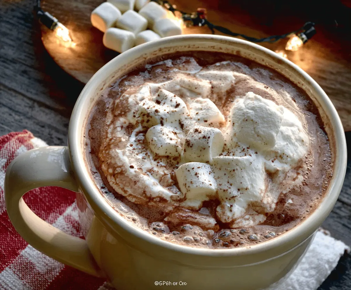 Using a ladle, pour the hot chocolate into mugs. Top each mug generously with mini marshmallows, and for an extra touch, sprinkle a little ground cinnamon or cocoa powder on top if you like. Serve immediately and enjoy your warm holiday treat!
