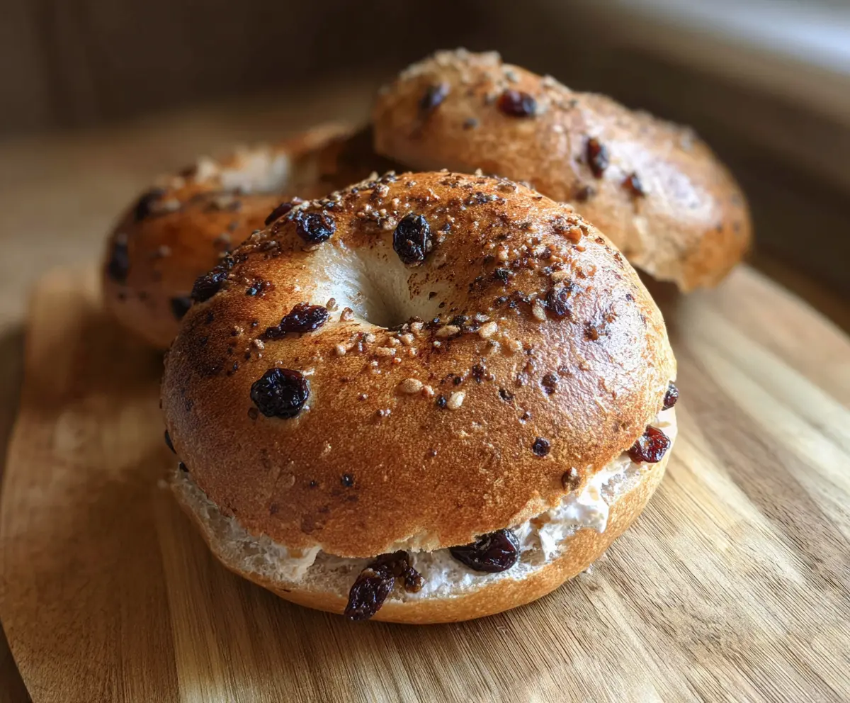 Freshly baked cinnamon raisin sourdough bagels on a wooden cutting board, showcasing golden crust and sweet raisin filling.