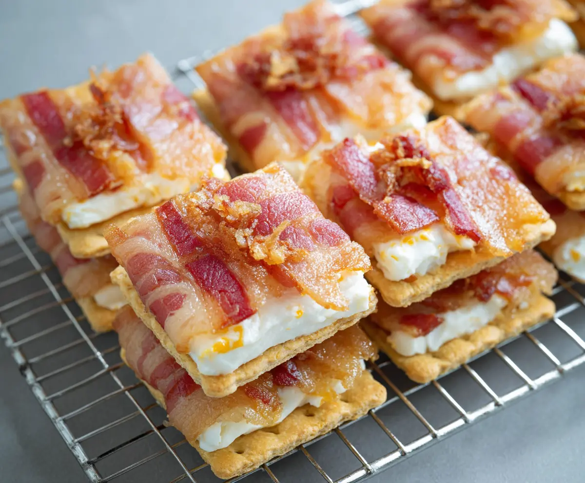 Cream Cheese Bacon Crackers on a plate, featuring crispy bacon and creamy cheese atop crunchy crackers, perfect for appetizers.