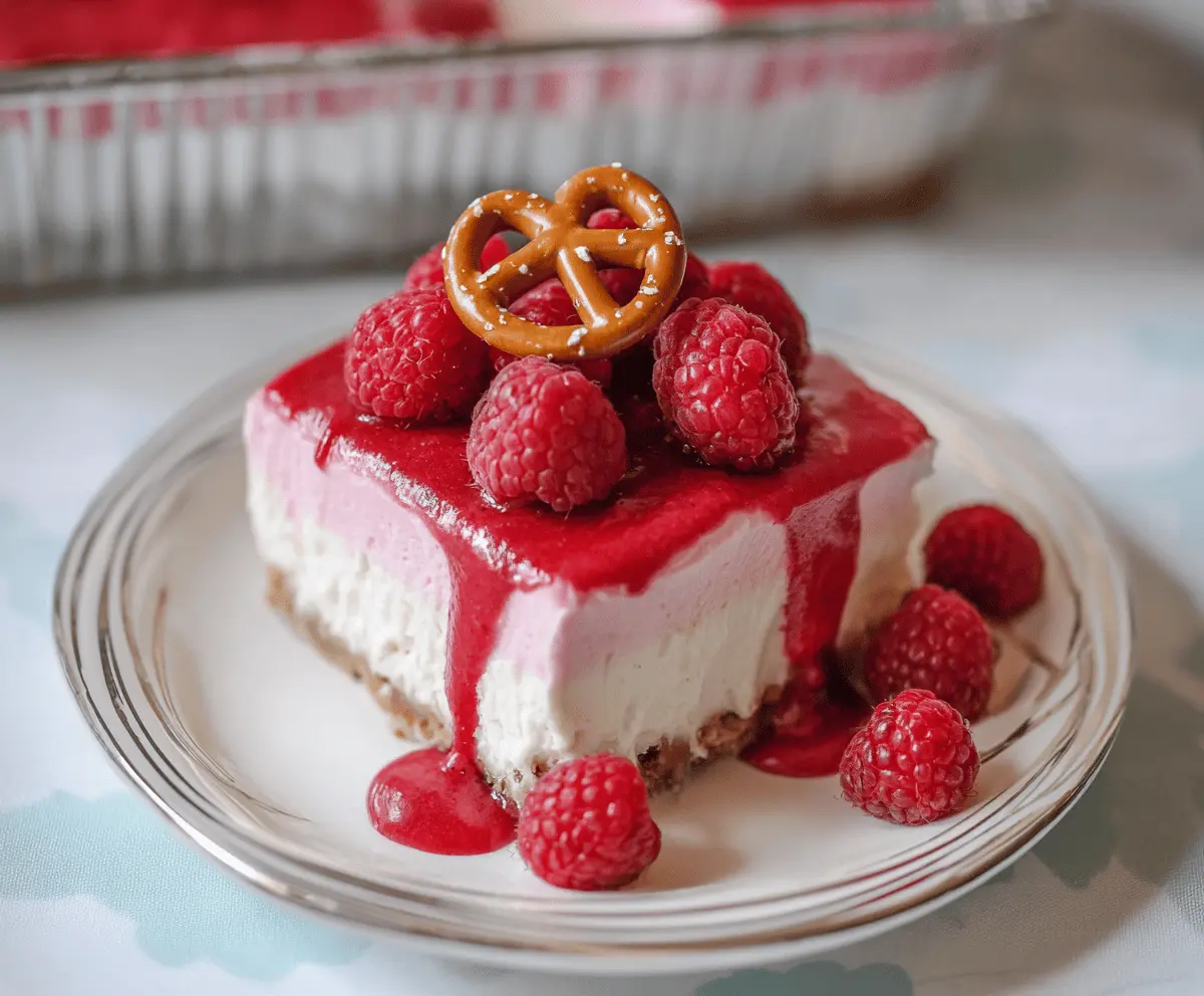 Delicious creamy raspberry pretzel dessert with fresh raspberries and a crunchy pretzel crust