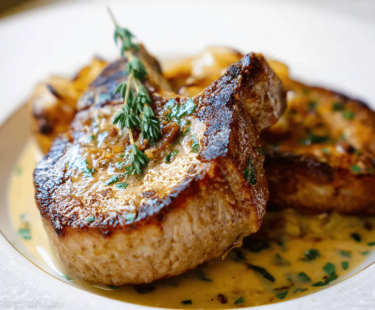 Juicy Dijon Pork Chops served with fresh herbs on a white plate, perfect for a flavorful dinner recipe
