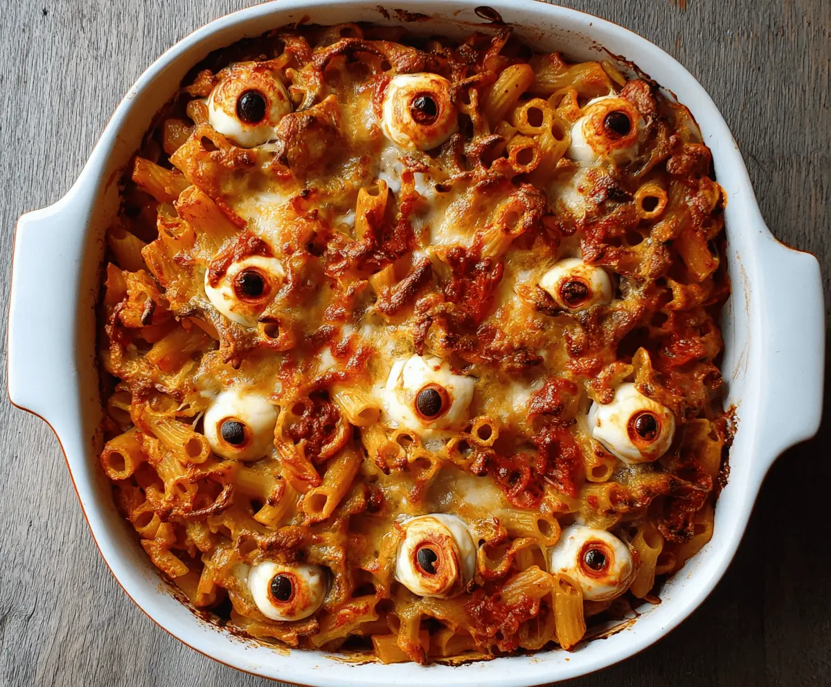 Eyeball Pasta Bake is a fun and spooky dish that’s perfect for a party! With pasta covered in tasty marinara sauce and gooey cheese, it looks like an explosion of flavor.