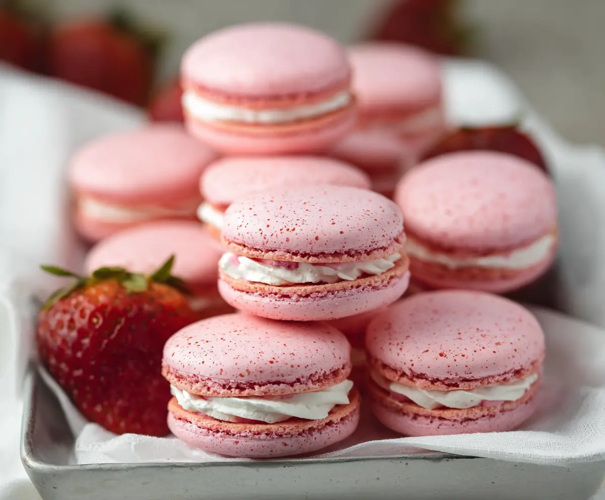 French strawberry macarons are little bites of joy! These delicate cookies are made with almond flour, egg whites, and sugar, filled with a sweet strawberry buttercream.