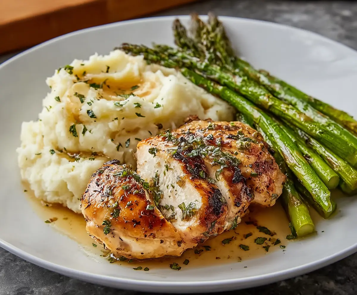 This Garlic Herb Chicken is juicy and packed with flavor, paired perfectly with creamy mashed potatoes and crispy roasted asparagus. It’s a comfort meal that feels special!