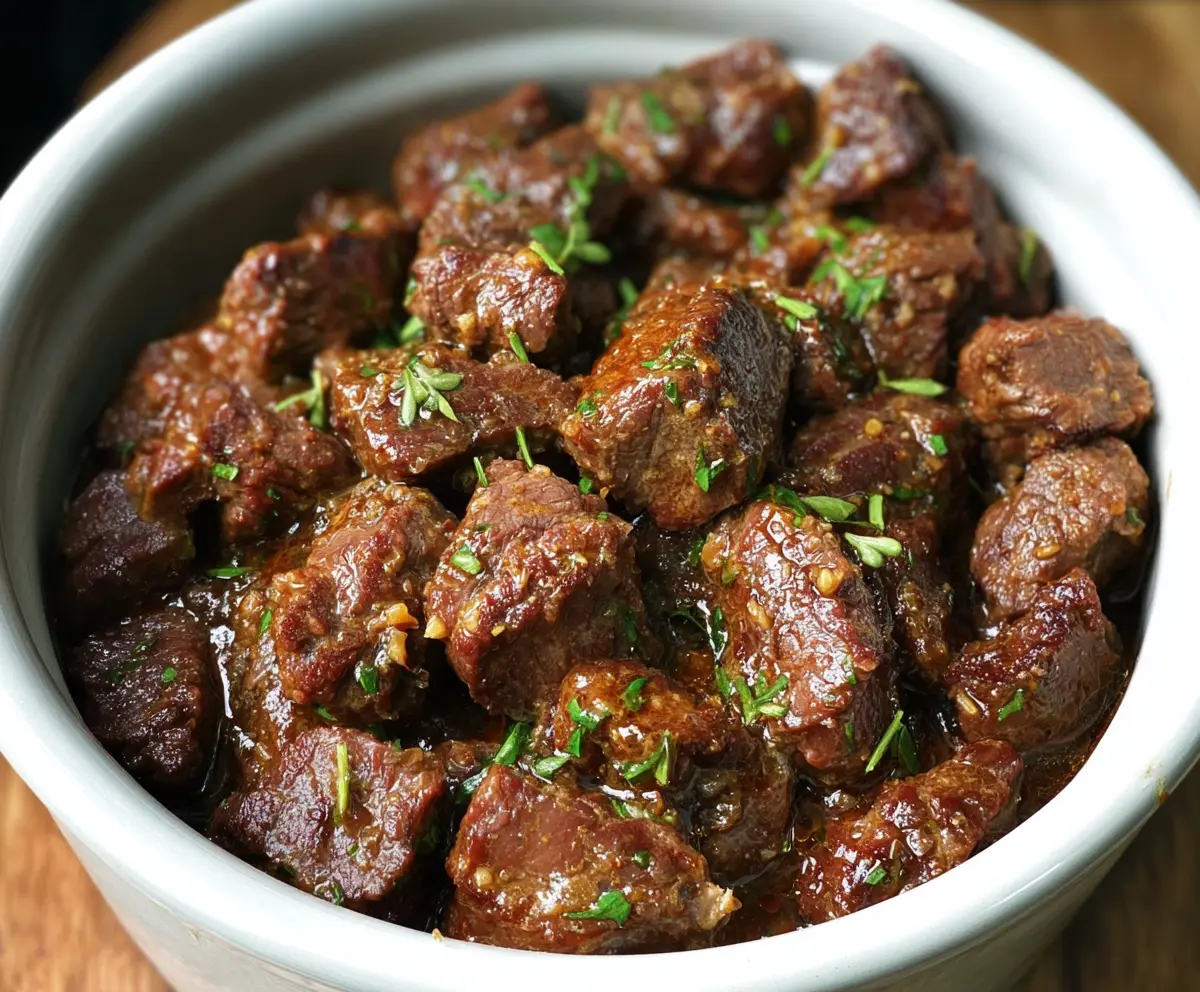 Once cooked, give the beef bites a gentle stir. They should be perfectly coated in the garlic butter sauce. Before serving, sprinkle fresh parsley over the top for a pop of color and flavor!