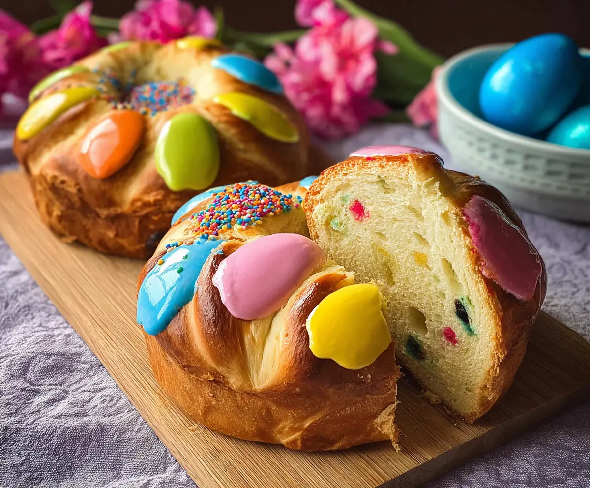 Festive Italian Easter bread topped with colorful eggs, perfect for holiday celebrations.