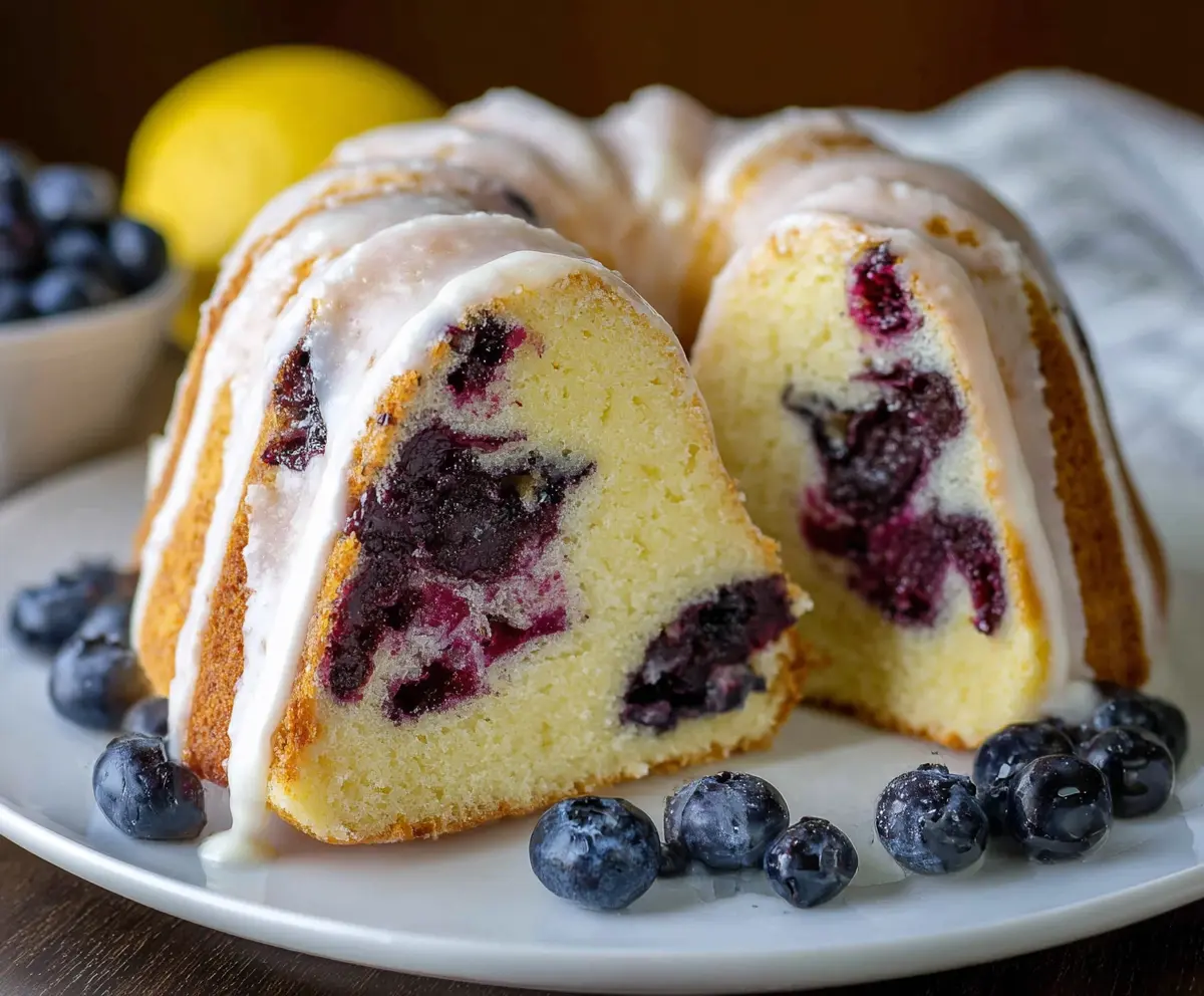 Once the cake is completely cooled, drizzle the lemon glaze evenly over the top. For a finishing touch, you can dust with powdered sugar or garnish with extra fresh blueberries and lemon slices before serving.