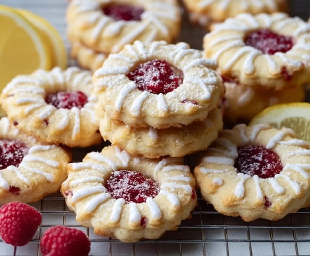 Let the glaze set for a few minutes before serving. Now your tender, buttery, lemony cookies with sweet raspberry centers are ready to be enjoyed. Happy baking!