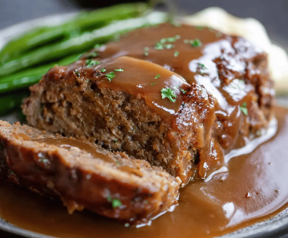 Spoon the brown gravy generously over the meatloaf slices. If you like, garnish with fresh parsley or a sprig of rosemary. Serve hot with mashed potatoes or your favorite vegetable sides for a comforting meal!