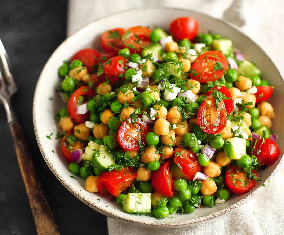 Start by grabbing a large mixing bowl. In it, combine the drained and rinsed chickpeas, peas, halved cherry tomatoes, sliced cucumber, and thinly sliced red onion. Give them a gentle stir to mix everything together beautifully.