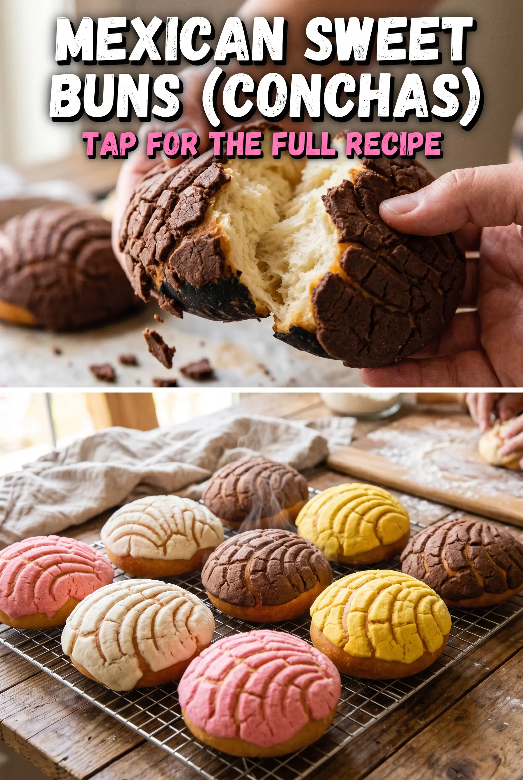 Mexican sweet buns (conchas) are tender, golden breakfast pastry buns topped with a shell-patterned sugar-butter crust in pastel colors. You’ll make a soft enriched dough, proof twice, then score the concha tops before baking.