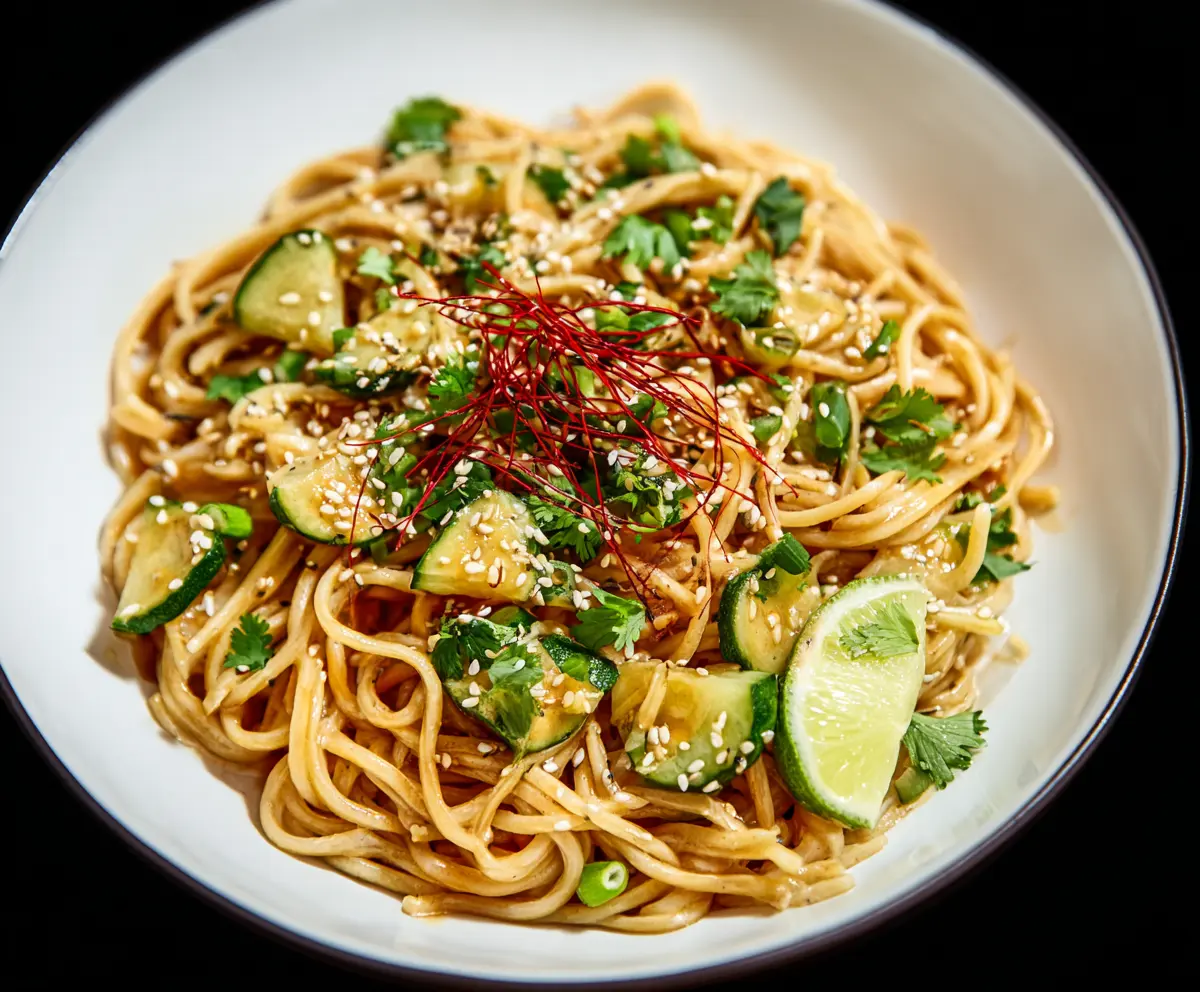 Dish out the pasta into bowls. Top each serving with sliced red chili peppers, toasted sesame seeds, and a sprinkle of fresh cilantro or parsley for garnish.