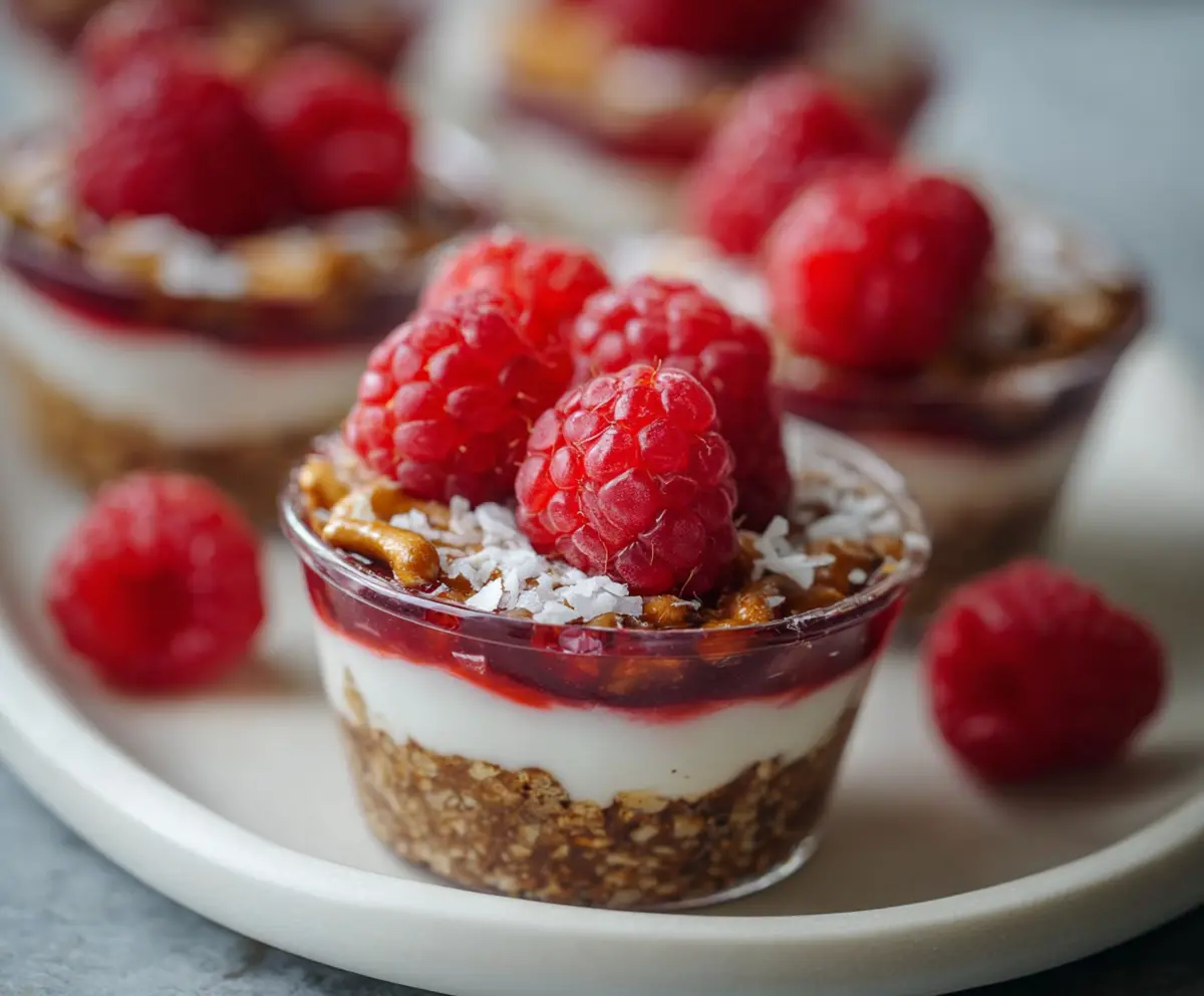 Top each cup with a dollop of whipped cream, then sprinkle some whole mini pretzels and fresh raspberries on top for a lovely garnish. These little touches make every bite enjoyable!