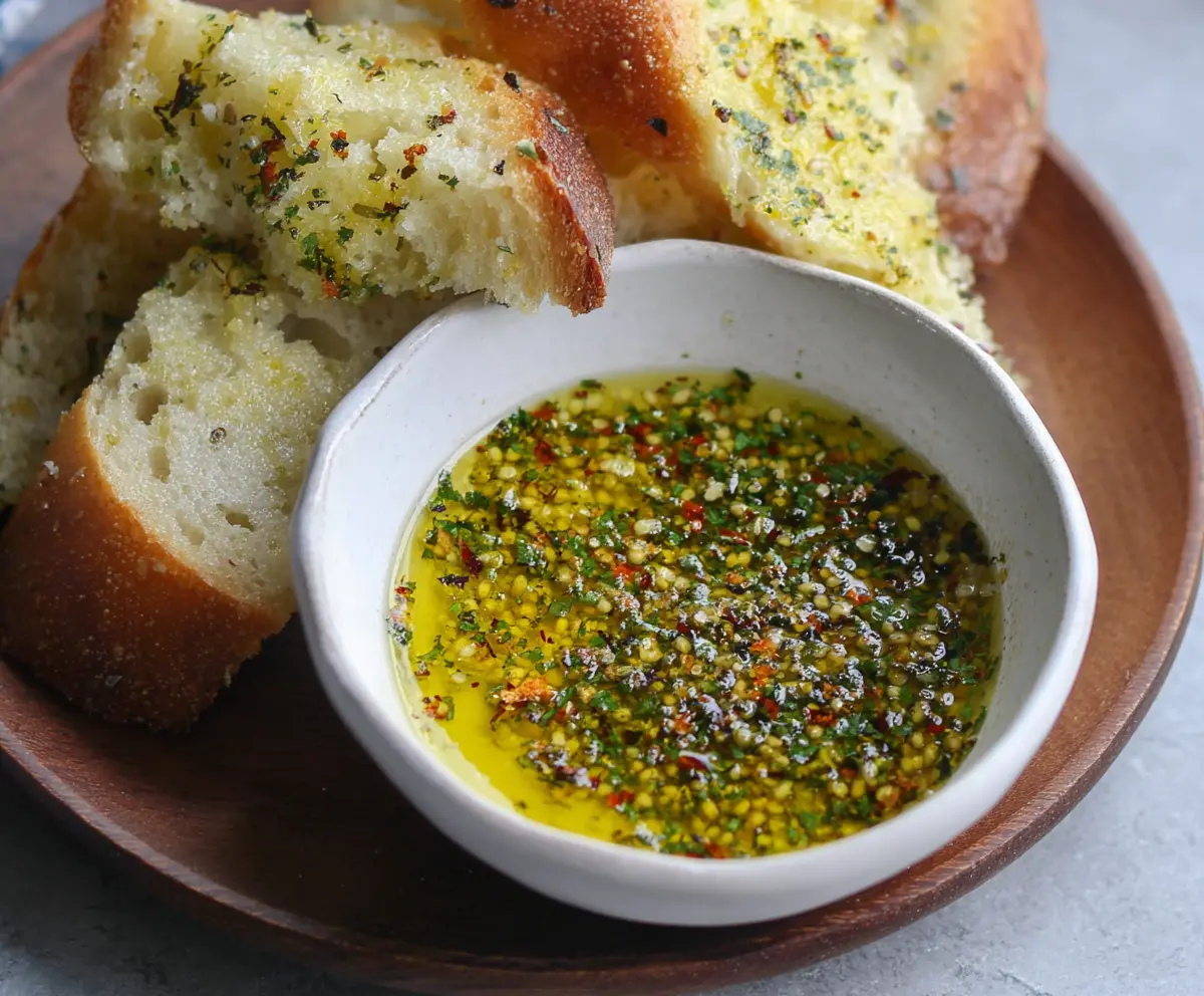 A close-up of a Mediterranean-inspired olive oil bread dip with herbs and spices served in a small bowl.