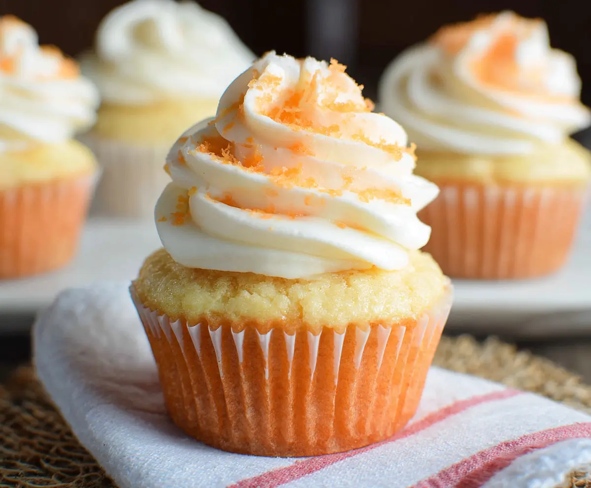 Delicious Orange Creamsicle Cupcakes topped with orange zest and creamy frosting.