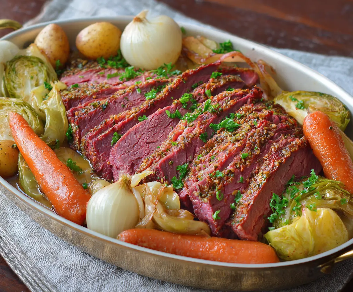 This recipe yields a wonderfully tender and flavorful corned beef served with delightful roasted vegetables, perfect for any dinner table!