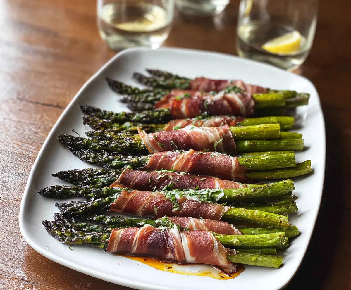 Delicious prosciutto wrapped asparagus spears, perfect for appetizers and parties.