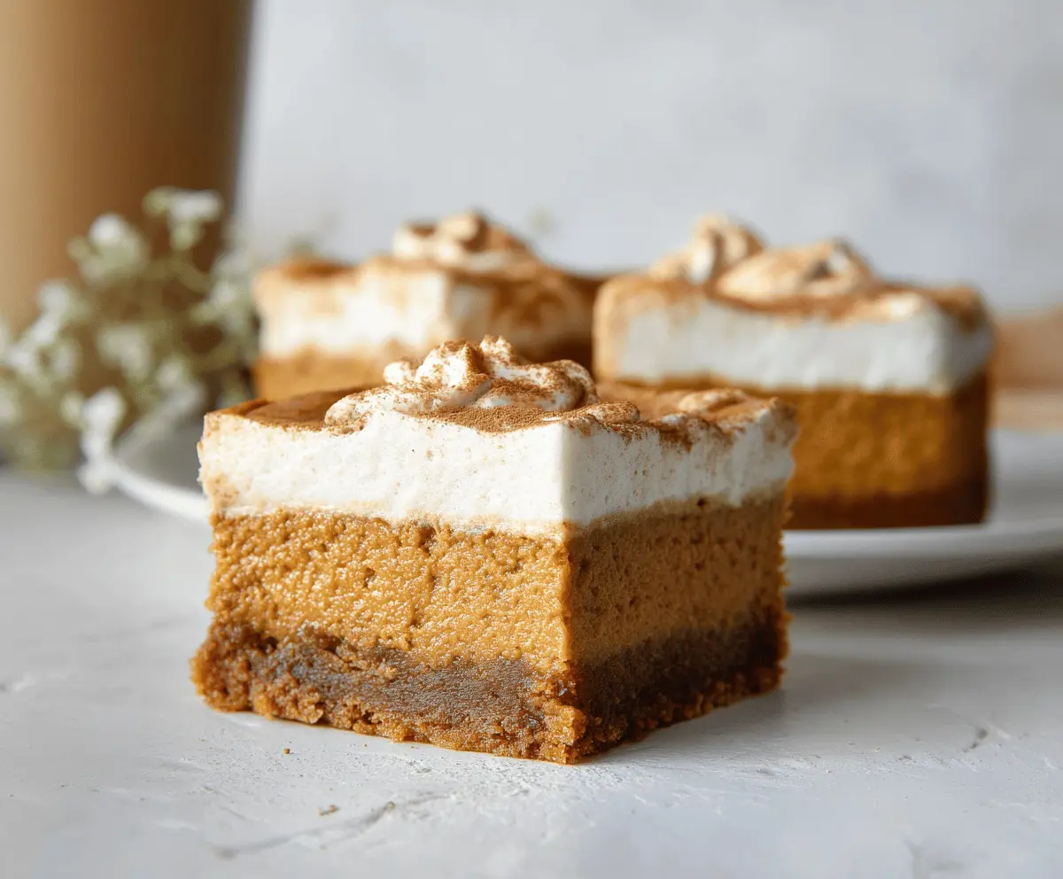 When you’re ready to serve, cut the chilled bars into squares. You can add a dollop of whipped cream on top and a sprinkle of cinnamon or pumpkin pie spice for a festive touch if you’d like!