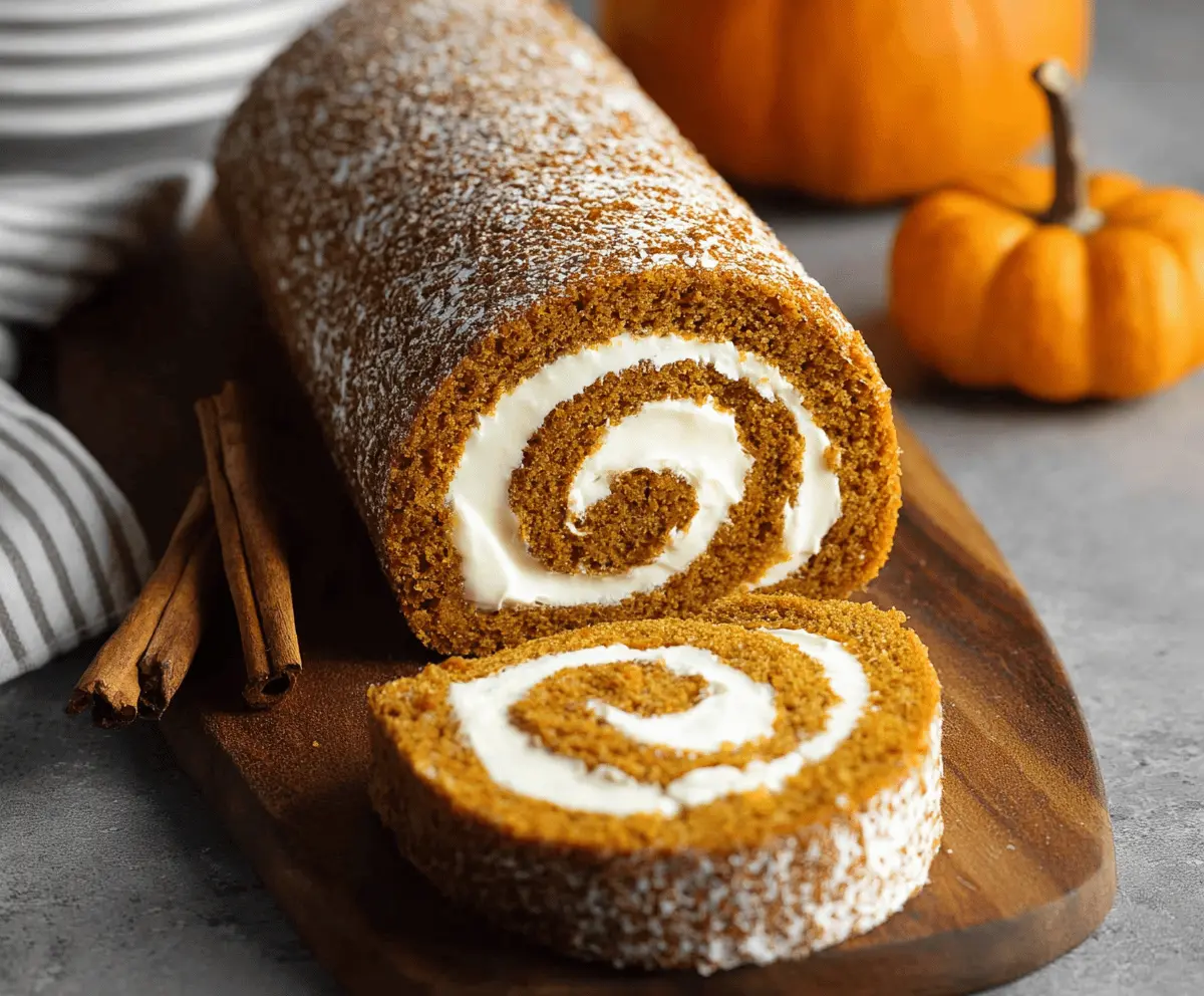 Delicious homemade pumpkin roll cake with cream cheese filling, topped with powdered sugar, perfect for fall desserts and holidays