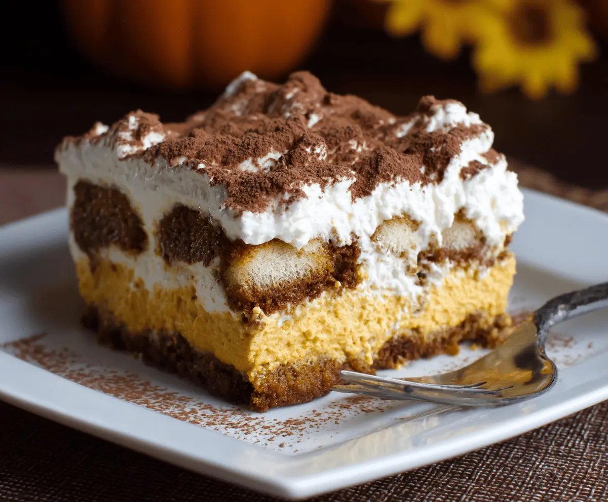 Delicious Pumpkin Tiramisu dessert layered with mascarpone cheese, pumpkin puree, and coffee-soaked ladyfingers, garnished with cocoa powder and cinnamon on top.